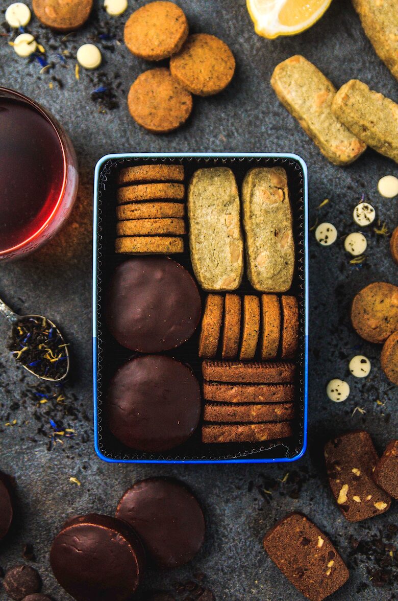 オリジナルデザイン缶に入れてお届けアールグレイ香るチョコだらけクッキー缶は5種の異なる味わいや食感のクッキーをオリジナルデザイン缶に入れてお届けします。