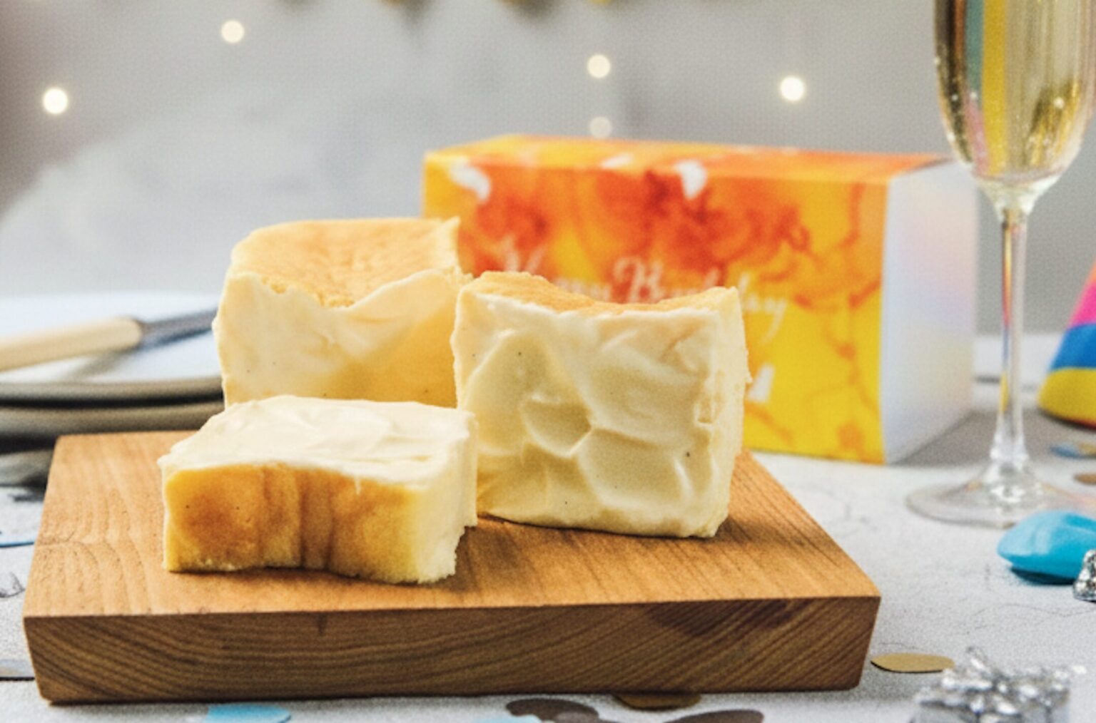 Happy Birthdayと書かれたお誕生日のお祝いを伝えるスリーブをお付けした化粧箱にとろ生チーズケーキを入れてお届けいたします。