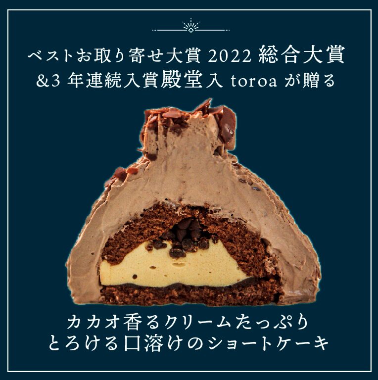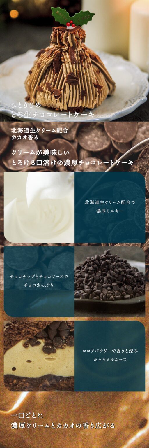 しっとりココアスポンジに濃厚チョコソースを重ね、ココアで香りと深みを加えたキャラメルムース、チョコチップ、ココアスポンジを重ねた層をカカオ香るガナッシュクリームで包み込み、ミルクチョコ コポーをトッピング。
