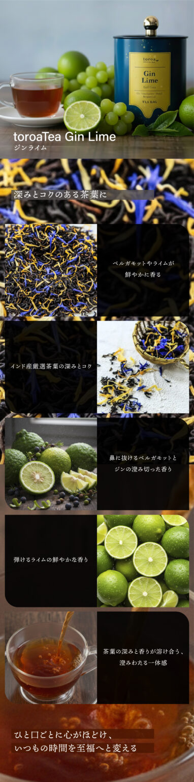 toroaTeaジンライムは、toroaTeaのスペシャリテ。一番人気の紅茶です。深みとコクのある茶葉にベルガモットやライム、マスカットが爽やかに香ります。