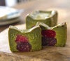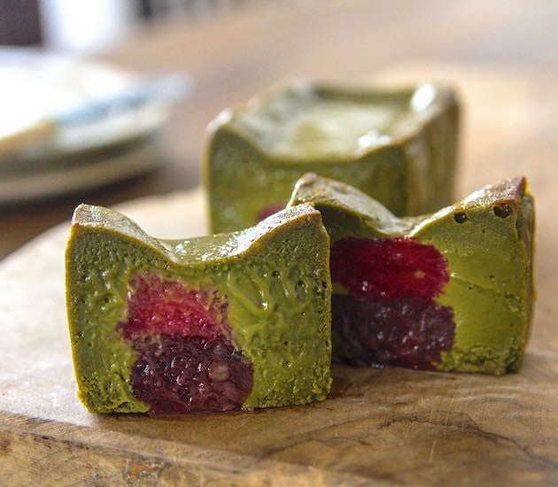鮮やかな緑色の京都宇治抹茶を使用していますが、生地の色味はやや深みのある色合いです。その理由は、チョコレートを配合しているため。一般的な抹茶ガトーショコラはホワイトチョコレートで作られることが多いですが、濃厚極いちご抹茶とろ生ガトーショコラは産地の異なる2種の華やか&ナッツティな高カカオチョコレートを配合することで香り高く、深みのある味わいに仕上げています。