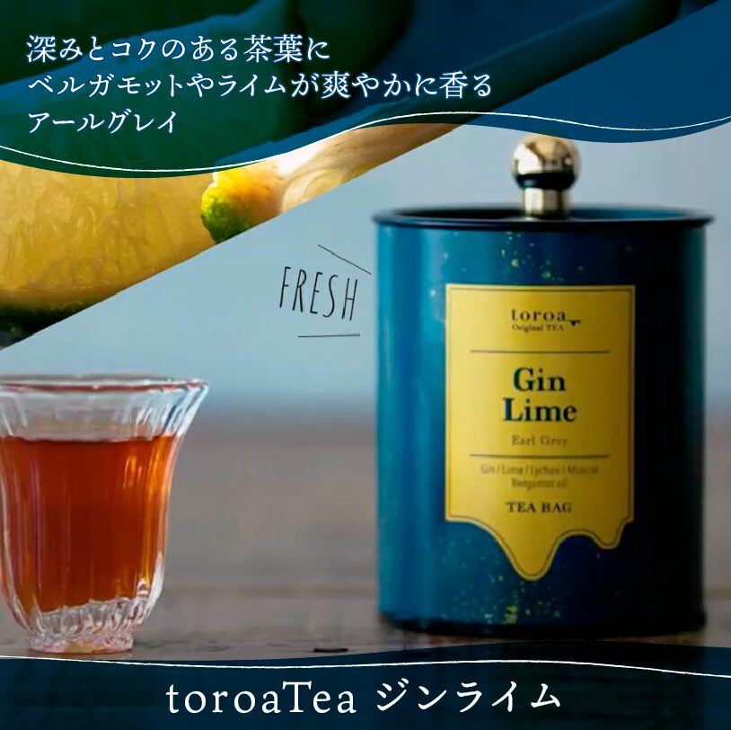 クッキーのお供にtoroaTeaのスペシャリテ「ジンライム」はいかがですか。深みとコクのある茶葉にベルガモットやライムが爽やかに香るすっきりとした味わいのアールグレイです。おうちカフェをぜひお楽しみください。商品情報
