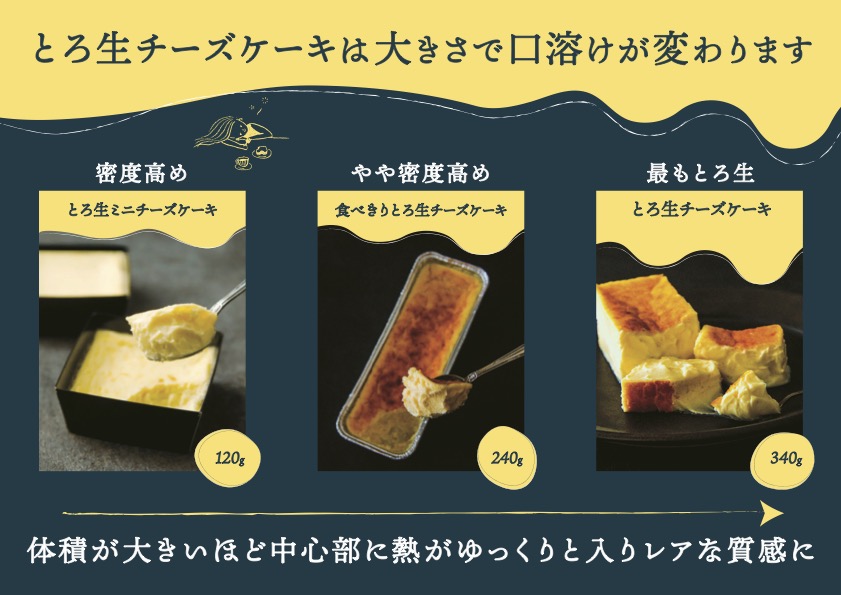 とろ生チーズケーキの名前の通り、“とろ生“な口溶けです。試作を重ねて焼き温度・時間を徹底追求することで、ひと口でとろける口溶けを生み出しました。この口溶けの良さに驚かれるお客様が多くいらっしゃいます。