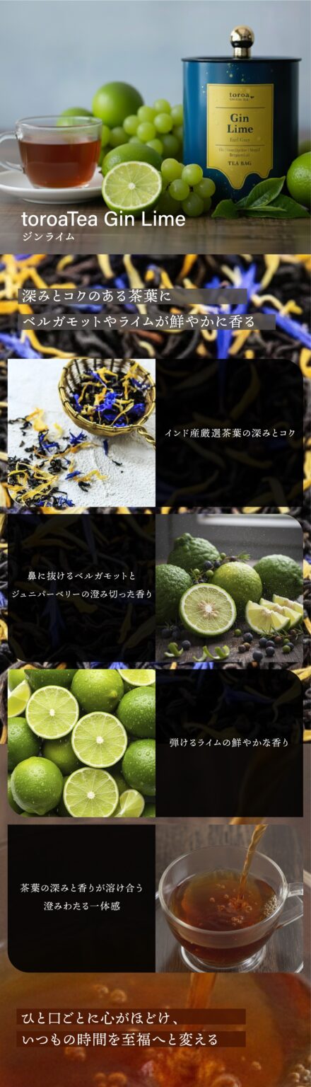 toroaTeaジンライムの隠し味は、クラフトジンにも使われる「ジュニパーベリー」。ライムとベルガモットが鮮やかに弾け、スッと抜けるキレと深い奥行きが共存します。