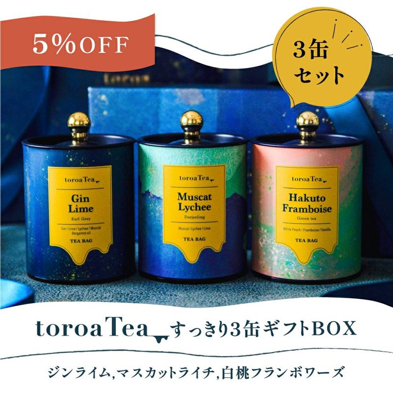 toroaTeaすっきり3缶ギフトBOXは、一番人気のジンライムをお入れした、すっきりとしたフレーバーを楽しめる贈り物に人気のセットです。アイスティーにしても美味しくお召し上がりいただけます。